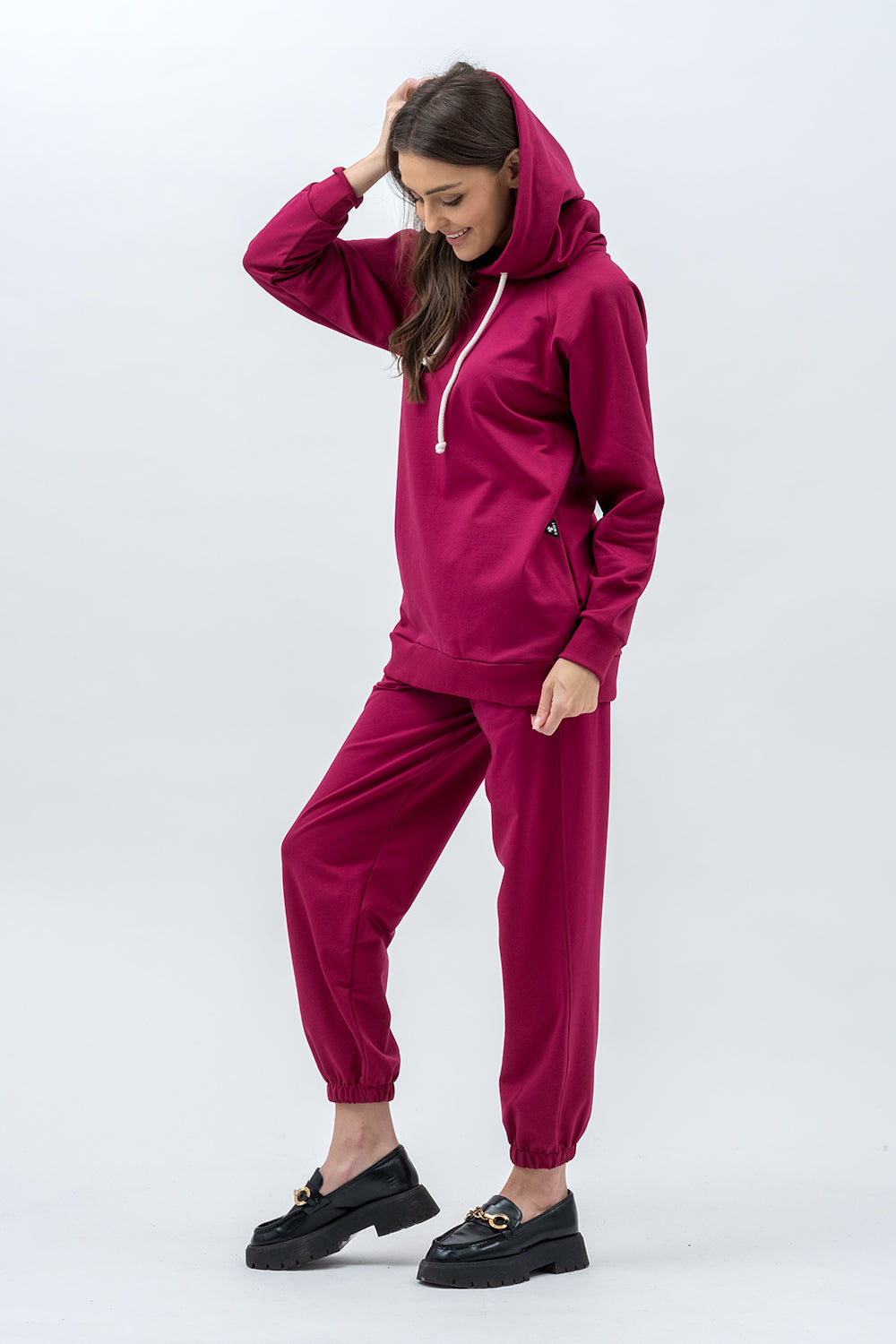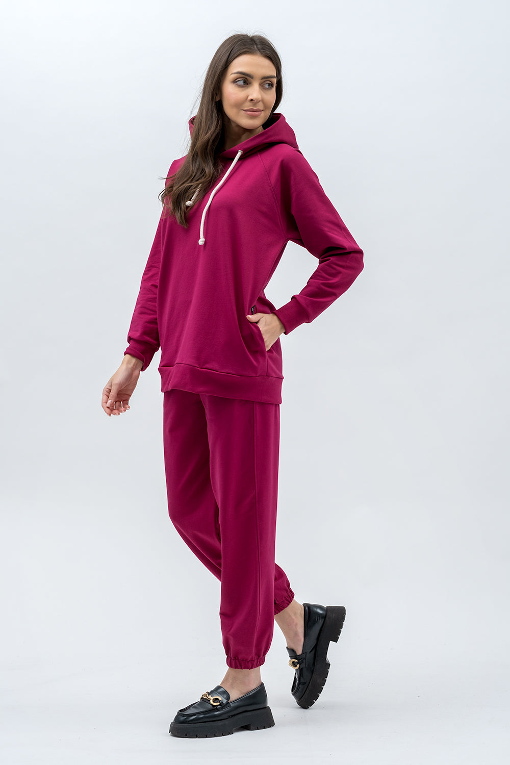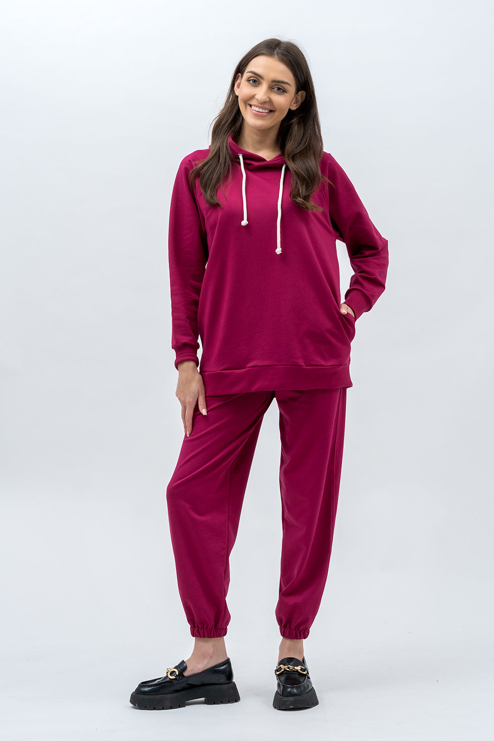 Bluza raglanowa z kapturem w którym jest sznurek .Bluza ma ukryte kieszenie i miękkie wykończenie, które otula.