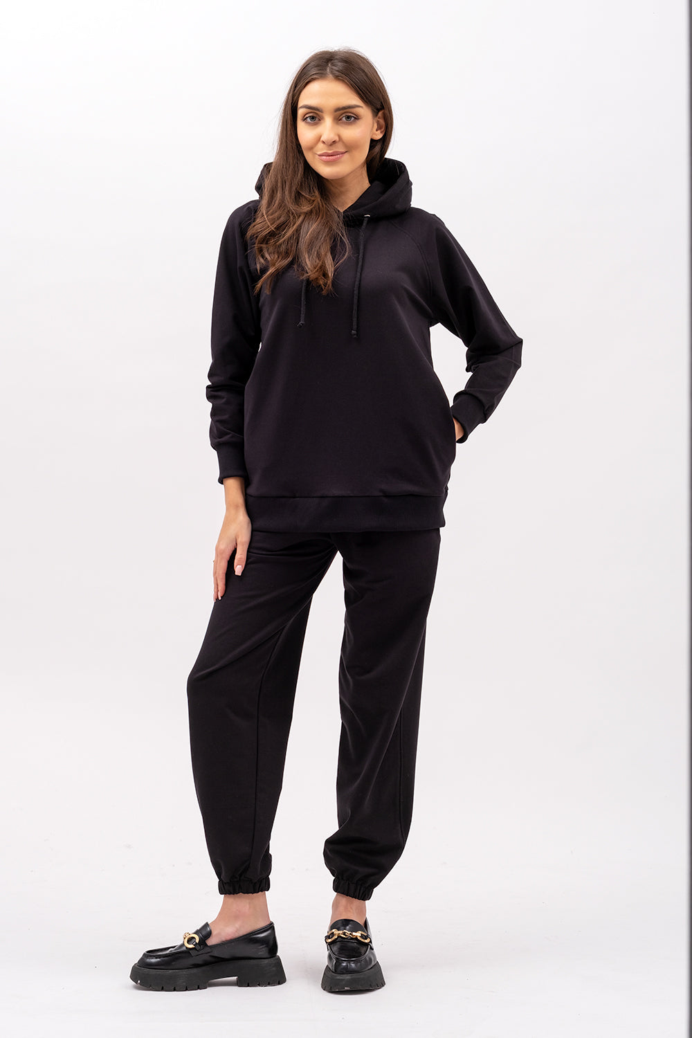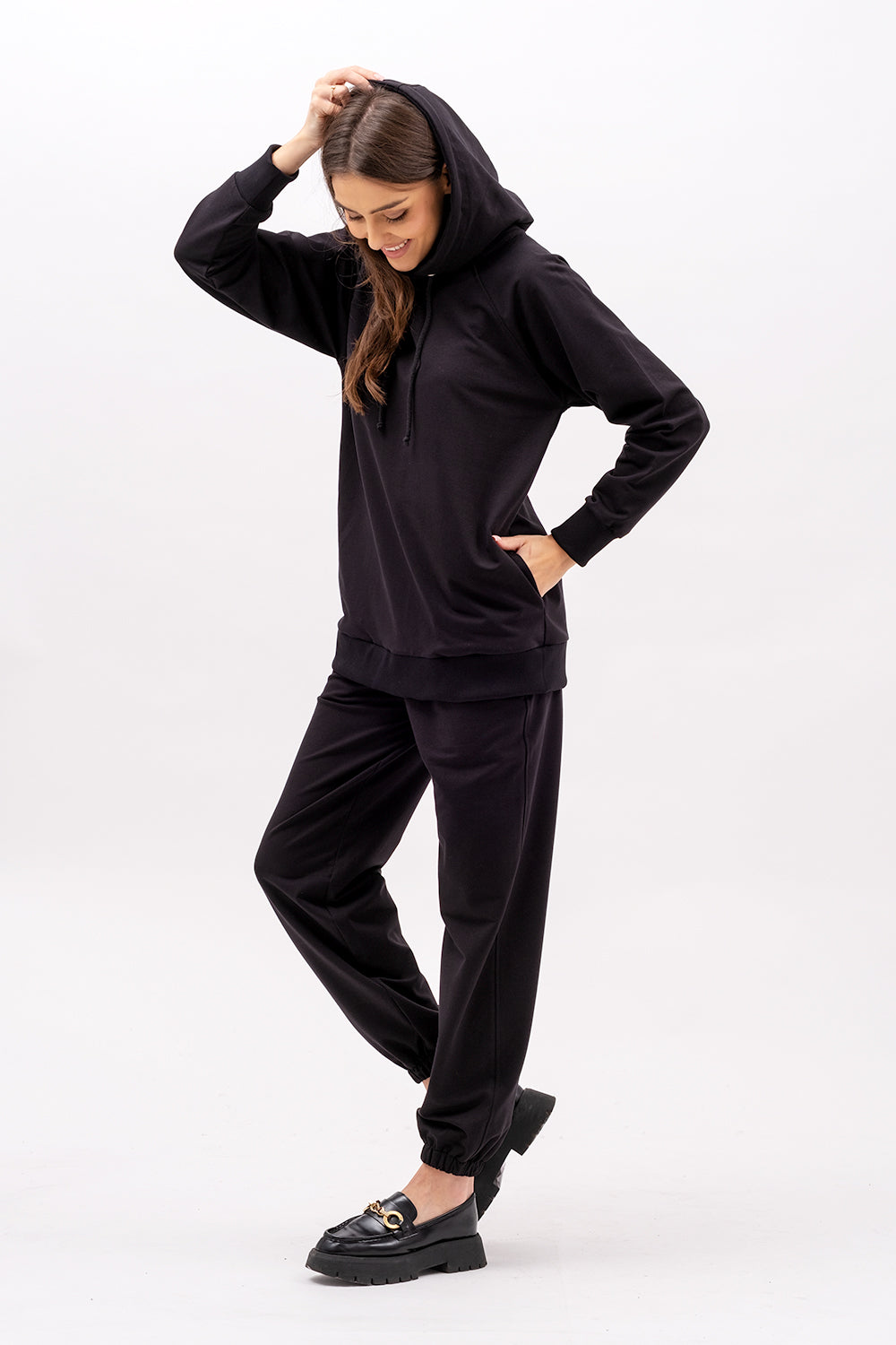 Bluza raglanowa z kapturem w którym jest sznurek .Bluza ma ukryte kieszenie i miękkie wykończenie, które otula.