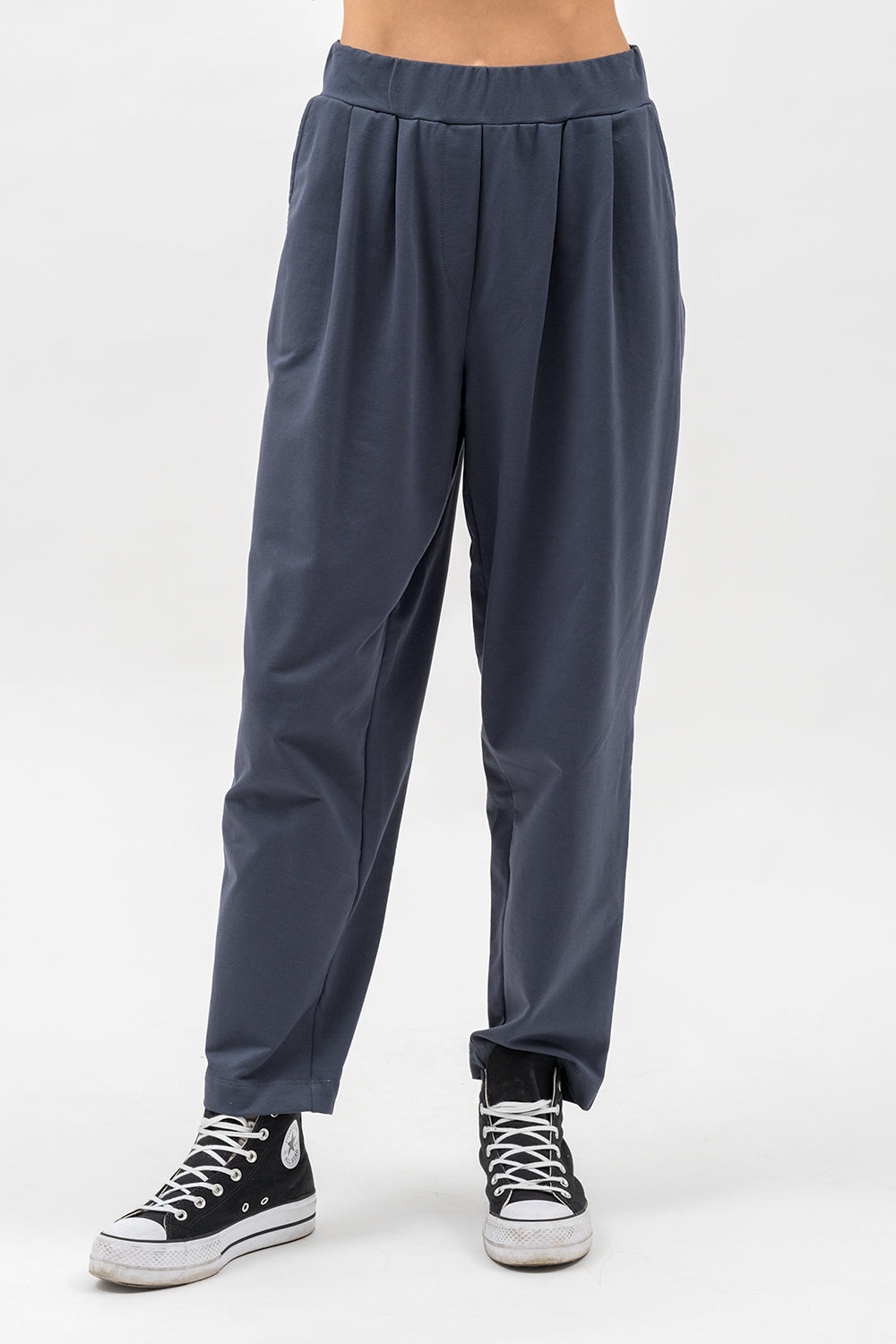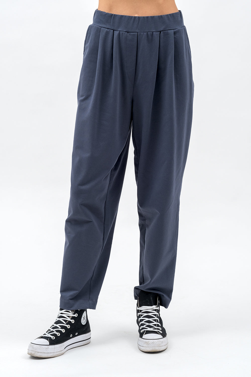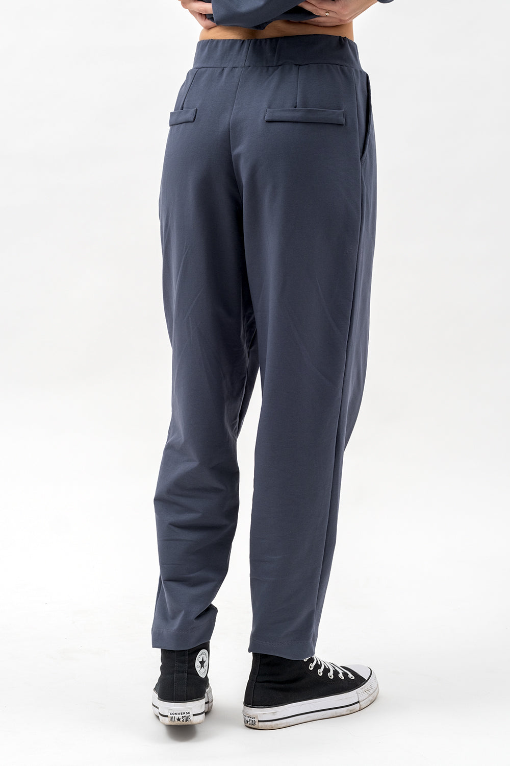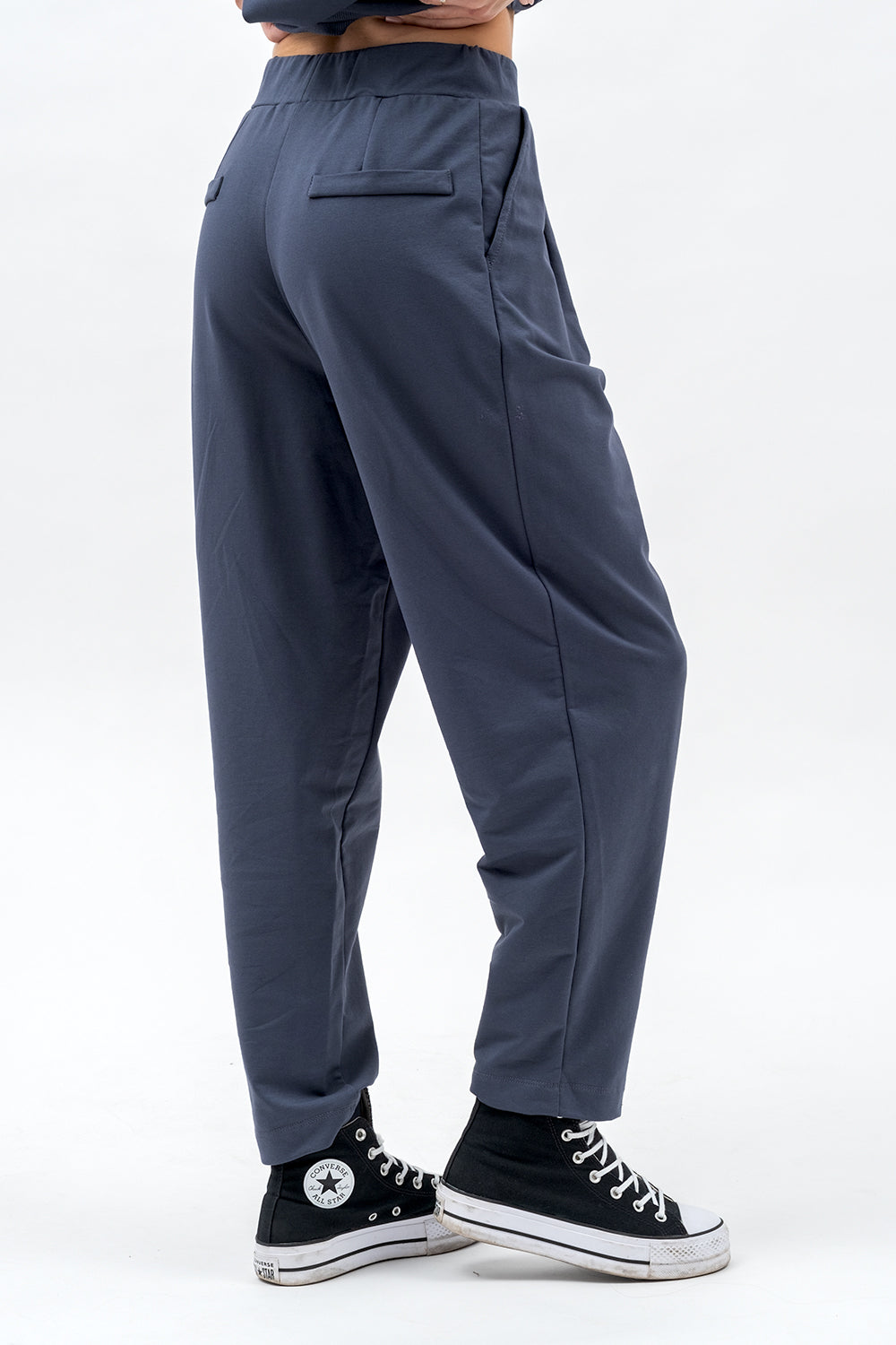 Model o szerszej, prostej nogawce zapewnia wygodę i lekkość w ruchu. Z przodu znajdują się kieszenie  oraz subtelne kontrafałdy, które dodają elegancji. Tył zdobią zaszewki i ozdobne patki, podkreślające kobiecą sylwetkę.